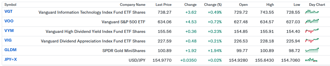 私のポートフォリオは前日比+0.84%と堅調でした。VGTやVOOが指数上昇を素直に取り込み、テクノロジー主導の相場の恩恵を受けました。一方で高配当系のVYMやVIGは小幅高にとどまり、守りの部分は安定的に推移しています。GLDMの上昇も全体を下支えし、分散の効果を改めて実感する一日でした。