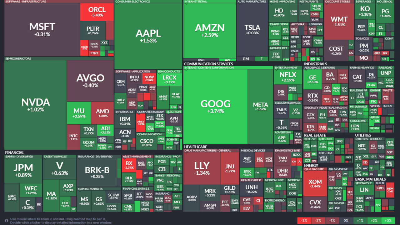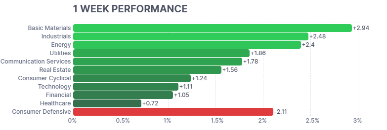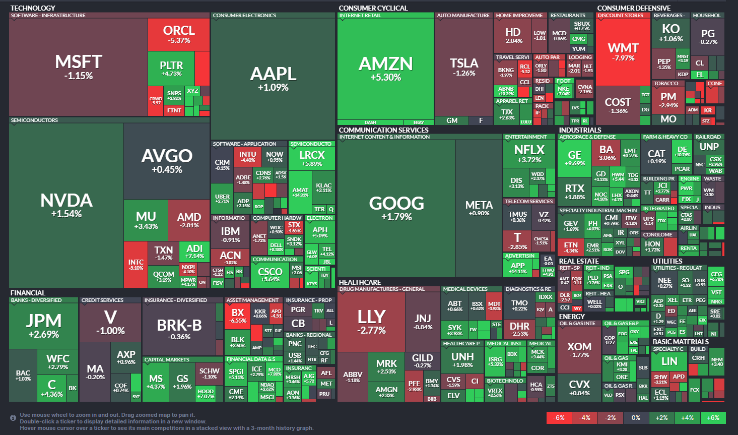 今週はAI関連や資源株が相場を牽引した週である。NVDAやAMZN、GOOGなど大型テックが堅調に推移し、半導体や通信関連にも買いが波及した。一方でWMTや一部ヘルスケア銘柄は軟調であり、ディフェンシブ株から成長株への資金シフトが鮮明であった。決算内容と金利動向に対する感応度の差が銘柄間の明暗を分けた週である。 - 1週間のセクター別騰落率動向
