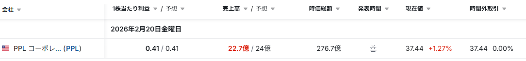 1株当たり利益は0.41ドルと市場予想と一致した一方、売上高は22.7億ドルと予想の24億ドルを下回った。電力需要は安定しているが、為替影響や規制コスト増が収益を圧迫した形である。もっとも通期見通しは維持され、配当の安定性が評価され時間外では小幅高となった。公益株としてのディフェンシブ性は維持されているとの判断である。