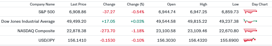 前日までの上昇の反動とハイテク株の下落が重荷となり、指数は反落である。AI関連や半導体の一角に利益確定売りが広がり、指数寄与度の高い大型株が押し下げた。一方でディフェンシブ(景気変動の影響を受けにくい銘柄)は底堅く、全面安ではない。長期金利の動向をにらみつつ、バリュエーション(株価評価)の調整色が強まった一日である。 - Dow30(49,499.20、+0.03%)