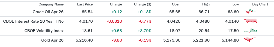 NASDAQ主導の下落を受け、投資家の不安心理を示すVIXは上昇した。20近辺が意識される水準であり、短期的なボラティリティ(価格変動)の高まりを示唆する。もっとも、パニック的水準ではなく、調整局面でのヘッジ需要増加の範囲である。 - 金先物(5,216.40ドル、-0.19%)