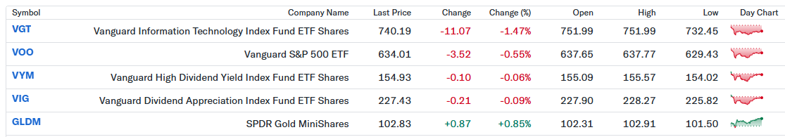 私のポートフォリオは前日比-0.24%と小幅な下落でした。VGTが-1.47%とテクノロジー株の調整を受けて下押ししましたが、VOOや高配当系のVYM、VIGは下落幅が限定的で全体を下支えしています。一方、金ETFのGLDMが+0.85%と上昇し、リスクオフ局面での分散効果を実感する一日でした。全体としては想定内の値動きと感じています。