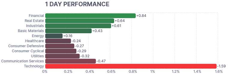 全体としては、金融や不動産など金利感応度の高いセクターが上昇する一方、先端技術(Technology)が大きく売られる展開であった。長期金利の低下は一部セクターを支えたが、AI関連株の調整が指数全体の重石となった。資金はグロース(高成長)からバリュー(割安)へと循環している構図である。