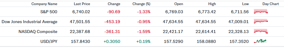 雇用統計で非農業部門雇用者数が9万2000人減と予想外のマイナスを記録し、労働市場の急減速が意識された。これに加え、イランを巡る中東紛争の激化で原油価格が1バレル90ドルを突破したことが、インフレ再燃と景気後退が同時に進む「スタグフレーション」への懸念を強めた。市場全体でリスク回避の動きが広がり、構成銘柄の約9割が下落する全面安の展開となった。 - ニューヨークダウ(47,501.55、前日比-0.95%)