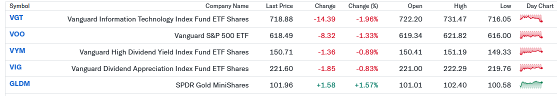 私のポートフォリオは、前日比で0.68%のマイナスとなりました。市場全体(S&P 500)が1.33%下落し、ハイテク株中心のVGTが1.96%安と大きく崩れる中で、下落幅を半分程度に抑えられたのは、保有しているVYM(高配当)やVIG(増配株)が比較的堅調に推移したためと考えられます。また、金価格の上昇に伴いGLDMが1.57%プラスとなったことが、ハイテク株の下落をうまく相殺し、ポートフォリオの守りとして機能した形です。