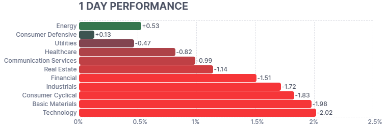 金利の高止まり懸念と地政学的リスクによるリスクオフの流れが直撃し、全セクターで最大の下落率を記録した。AI関連銘柄を中心に利益確定売りが加速し、指数を大きく押し下げる要因となった。 - 素材(Basic Materials) -1.98%