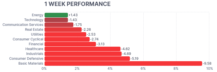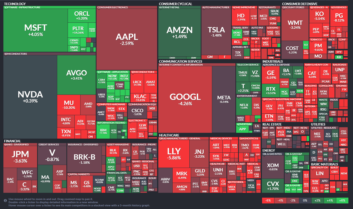 今週のヒートマップは、週後半に発生した中東情勢の緊迫化と予想を大幅に下回る2月雇用統計の結果を受け、多くの銘柄が赤く染まる展開となった。特に成長期待が高かった大型ハイテク株や、景気敏感な金融、素材セクターでの下落が目立っている。一方で、マイクロソフト(MSFT)やオラクル(ORCL)など、堅調な決算やAI戦略が評価された一部の銘柄が逆行高を見せ、市場全体の底割れを辛うじて防ぐ構図となった。 - エネルギー独歩高と景気減速懸念によるセクター別騰落の明暗