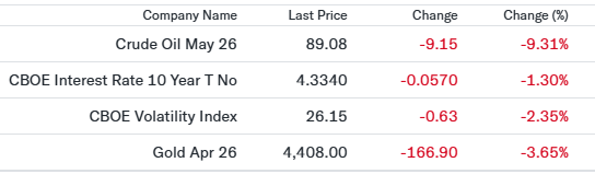 歴史的な暴落を記録した。トランプ大統領がイランに対する攻撃を5日間停止し、外交による解決を模索すると表明したことで、供給途絶への懸念が急速に後退した。100ドルをうかがう展開から一転、利益確定売りが殺到し、インフレ圧力の緩和期待を市場にもたらした。 - CBOE Interest Rate 10 Year T No(4.3340、-1.30%)