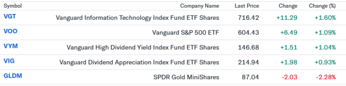 本日の私のポートフォリオは、市場全体のリスクオンムードに乗り、堅調な一日となりました。特に先端技術セクターのVGTが1.60%高と力強く上昇し、全体のパフォーマンスを牽引してくれたのが大きかったです。一方で、金先物の下落に伴いGLDMが2.28%安と足を引っ張る形になりましたが、株式ETFの好調がそれを十分にカバーしてくれました。地政学リスクの緩和が、保有銘柄の多くにプラスに働いた安心感のある結果でした。