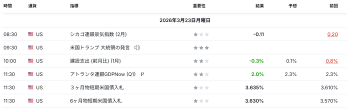 2月のシカゴ連銀全米活動指数は-0.11となり、前月の0.20から低下してマイナス圏に転じた。この指数は85の経済指標を統合したもので、0を下回ると経済成長が歴史的な平均を下回っていることを示唆する。生産関連指標の軟調さが主な押し下げ要因となっており、米経済の成長ペースが緩やかに減速している可能性を裏付ける内容となった。 - 建設支出(前月比)(1月) 結果:-0.3%、予想:0.1%、前回:0.8%