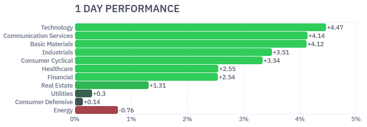 3月31日の米国株式市場は、前日のリスクオフムードから一転し、広範囲で買い戻しが進む極めて力強い展開となった。特に先端技術や通信サービスといった成長セクターに爆発的な資金流入が見られたほか、景気敏感な素材や工業セクターも大幅に上昇した。金利上昇への警戒感が和らぎ、主要セクターが軒並みプラス圏で推移する中で、エネルギーセクターのみが逆行安となるなど、セクター間の選別も明確に現れた一日であった。