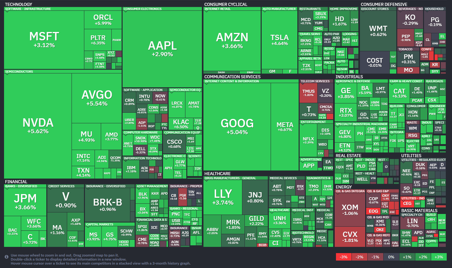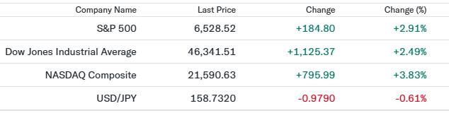- S&P500(6,528.52、前日比+2.91%)