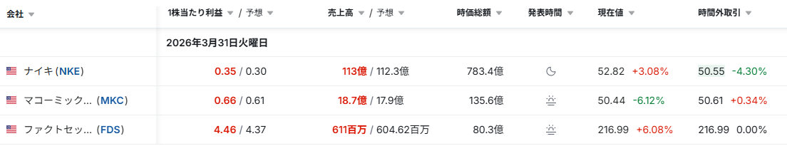 ナイキは売上高・EPSともに市場予想を上回り、ブランド力と価格戦略の有効性が確認された。特に北米市場での販売回復と在庫調整の進展が収益改善に寄与した。一方で中国市場の回復にはばらつきがあり、地域間での成長差が課題である。デジタル販売強化や直販モデルの拡大は中長期の成長ドライバーであり、株価は好決算を受けて上昇したが、今後は需要持続性が焦点となる。 - MKC:McCormick & Company Inc(生活必需品)