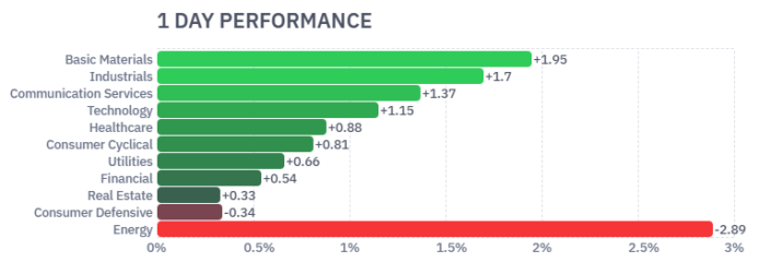 セクター別で最大の上昇率を記録した。地政学リスクの後退に伴う世界経済のソフトランディング期待が強まり、化学や鉱業関連の銘柄に幅広く買いが入った。ドル高の一服感も商品市況に関連する素材株の下支え要因となった。 - 工業・産業(Industrials) +1.7%