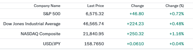 続伸し、前日の急騰に続く堅調な動きを見せた。イランによる停戦示唆や原油価格の下落を受け、インフレ再燃懸念が和らいだことが投資家心理を改善させた。素材や工業・産業といった景気敏感セクターに幅広く買いが入る一方、個別銘柄では通期見通しを下方修正したナイキが10%超急落し、指数の上値を抑える場面もあったが、ハイテク株の強い上昇が全体を支える展開となった。 - Dow Jones Industrial Average(46,565.74、+0.48%)