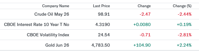 低下した。主要3指数が揃って反発し、市場の過度な不透明感が和らいだことで、投資家の恐怖心理を反映するVIX指数も落ち着きを見せた。中東情勢の沈静化期待からリスクオンの姿勢が戻り、直近の急騰に対する反動も加わって、節目となる25を下回る水準まで押し戻される形となった。 - 金先物(4,783.50、+2.24%)