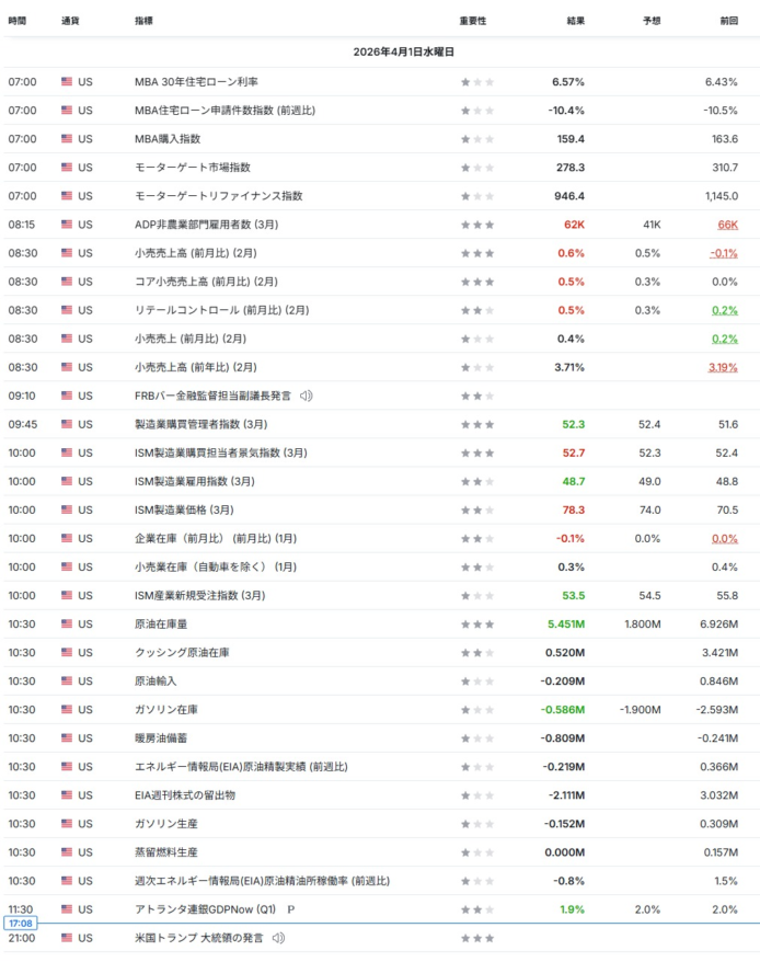 3月のISM製造業景況指数は52.7と、好不況の節目である50を上回り、市場予想をも超える強い結果となった。製造業の拡大ペースが加速しており、景気回復の勢いが鮮明になっている。ただし、仕入価格指数が78.3と大幅に上昇しており、原材料コストの増大が今後のインフレ指標に与える影響が懸念される。 - 原油在庫量(結果:5.451M、予想:1.800M)
