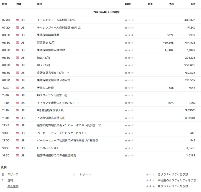 アトランタ連銀が発表した第1四半期のリアルGDP成長率予測「GDPNow」は、1.9%へとわずかに下方修正された。前回の2.0%からは低下したものの、依然として米経済が潜在成長率を維持していることを示している。製造業や消費関連の強いデータが反映される一方で、在庫投資の調整が押し下げ要因となった。景気後退の懸念を打ち消す内容として、投資家の安心感を誘った。(Investing.com:04/01)