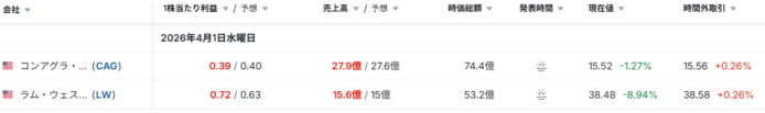 2026年度第3四半期決算を発表した。調整後EPSは0.39ドルと市場予想の0.40ドルにわずかに届かず、売上高は27.9億ドルで予想を上回った。オーガニック売上高が2.4%増と改善の兆しを見せた一方、コストインフレや競争激化による利益率の圧迫が続き、調整後EPSは前年同期比で約23%の大幅減益となった。通期の業績見通しについては、利益目標をレンジの下限付近に絞り込む慎重な姿勢を示した。 - LW:Lamb Weston Holdings, Inc.(生活必需品)