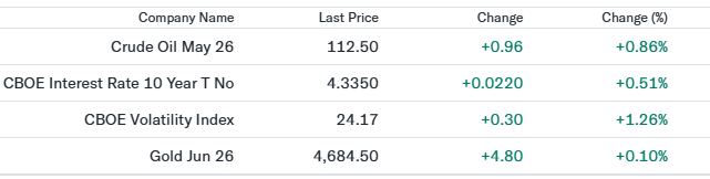 続伸した。イランとイスラエルの緊張緩和に向けた外交努力が報じられる一方、依然として供給途絶リスクが意識されている。3月の米雇用統計が市場予想を大幅に上回り、エネルギー需要の底強さが示されたことも相場を下支えした。地政学的な不透明感と堅調な米経済指標が交錯し、原油価格は高値圏での推移を維持している。 - CBOE Interest Rate 10 Year T No(4.3350、+0.51%)