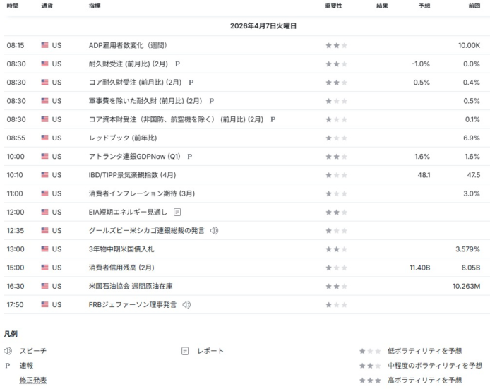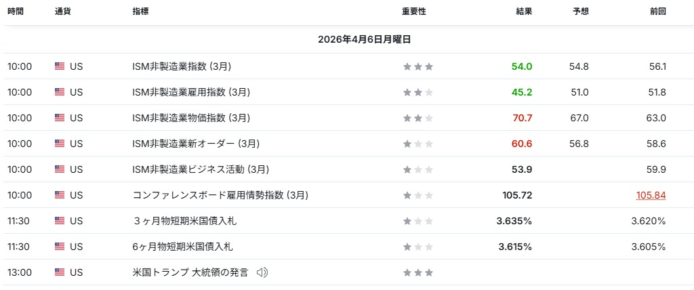トランプ大統領は、ホルムズ海峡が閉鎖されたままの場合、イランのインフラ施設を攻撃するとの期限を翌日の夜に設定し、緊張感が高まっている。しかし、市場参加者はこの強硬姿勢を交渉戦術の一部と捉えており、大きな動揺は見せていない。ホワイトハウスでの会見が予定されている中、投資家は軍事行動の回避とガソリン価格の安定に向けた政治的妥協の可能性を注視している。(Bloomberg:04/06) - ISM非製造業景況指数の鈍化とインフレ圧力の持続