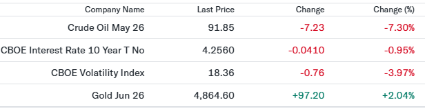 米10年債利回りは低下した。地政学リスクの緩和期待から「質への逃避」としての債券買いは一服したものの、原油価格の急落を受けて将来のインフレ懸念が後退し、債券価格が押し上げられた。利回りは一時4.3%を割り込み、3月中旬以来の低水準を記録。金利低下が株式市場、特にグロース株への資金回帰を促す要因となった。 - CBOE Volatility Index(18.36、-3.97%)