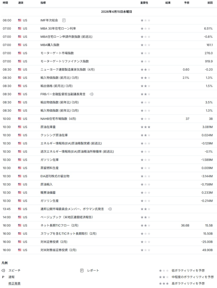 トランプ大統領が週内にイランとの和平交渉を再開する可能性を示唆したことで、中東情勢の緊張が急速に緩和した。供給途絶懸念の後退から原油先物価格は一時7%を超える大幅下落を記録し、地政学的なリスクプレミアムが大きく剥落した。市場は「有事の売り」から一転してリスクオンの姿勢を強め、主要指数の押し上げ要因となった。(Bloomberg:04/14) - 金融大手の決算は明暗が分かれる展開