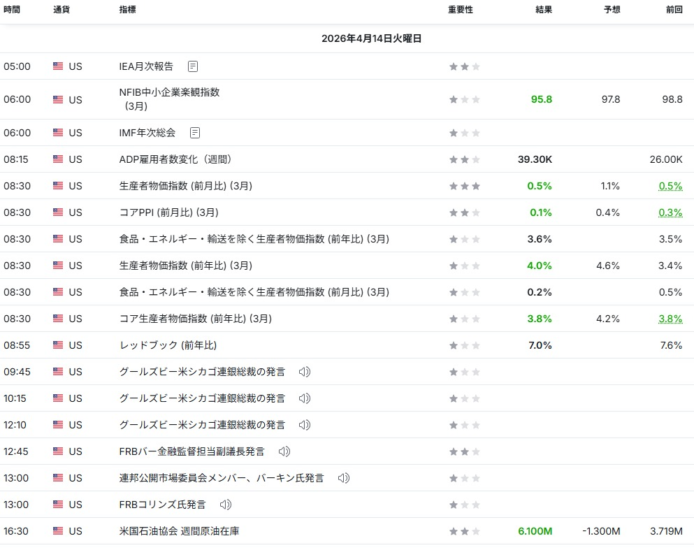 前年比の結果は4.0%となり、市場予想の4.6%を大きく下回った。前月比でも0.5%の上昇に留まり、卸売り段階でのインフレ圧力が想定以上に鈍化していることが示された。ガソリン価格の上昇が全体を押し上げたものの、サービス価格が横ばいとなったことが抑制要因となった。インフレ沈静化への期待から、FRBによる利下げ観測を後押しするポジティブな内容となった。 - コア生産者物価指数(3月)