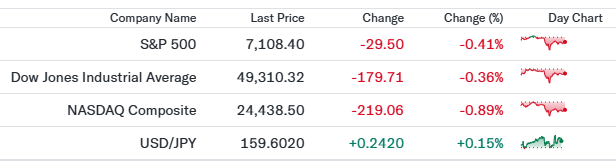 S&P500は反落した。クラウドソフトや大型ハイテク株への売りが重しとなる一方、公益事業や生活必需品などディフェンシブ株には資金が向かった。決算内容が市場の高い期待に届かなかった銘柄への失望売りも広がり、指数全体では上値の重い展開であった。金利動向と企業業績を見極めたい投資家心理が強く、積極的な買いは限定的であった。 - Dow30(49,310.32、前日比-0.36%)