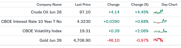 VIX指数は上昇し、市場の警戒感がやや高まった。主要株価指数の下落に加え、決算発表後の個別株急落や中東情勢への懸念が投資家心理を冷やした。20近辺は過度な恐怖ではないが、慎重姿勢を示す水準である。 - 金先物(4,706.90、前日比-0.97%)
