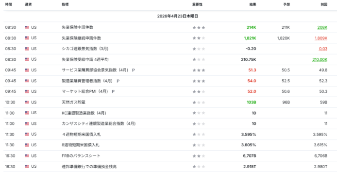 新規失業保険申請件数は214Kとなり、市場予想211Kをやや上回った。前週208Kからは増加したが、依然として歴史的には低水準であり、米労働市場の引き締まり継続を示す内容である。雇用環境が大きく崩れていないため、FRBが早期利下げを急ぐ必要性は乏しく、金利高止まり観測を支える材料となった。 - 失業保険継続受給件数