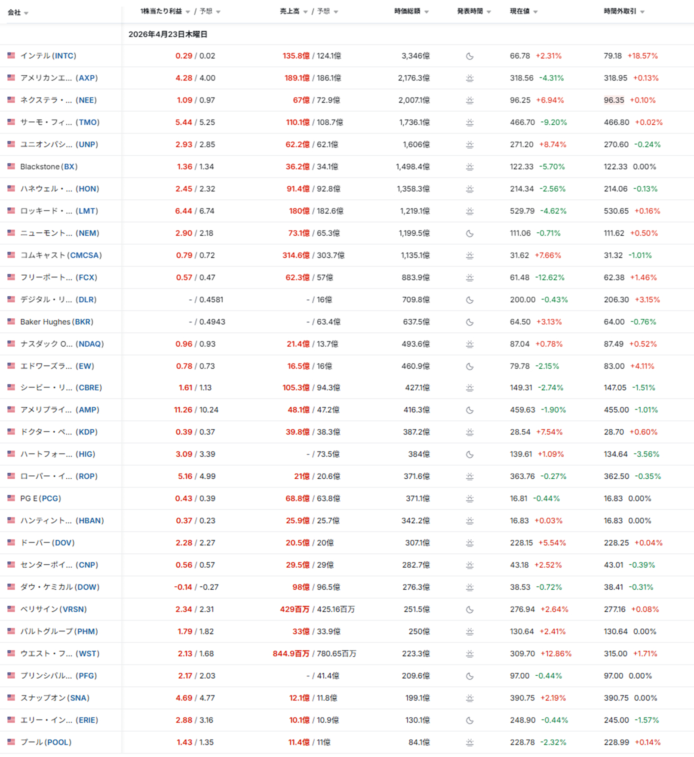 主要3指数はそろって下落し、NASDAQの下げが目立った。背景には、米・イランの停戦が不安定化する中で原油価格が上昇し、企業収益とインフレへの警戒が強まったことがある。決算は総じて悪くないが、地政学リスクが相場の主導権を握りやすい地合いであった。(Reuters:04/23) - Intelが引け後に急伸し半導体内の主役交代期待